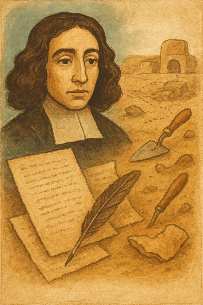 Antes de qualquer escavação, a ferramenta mais afiada para analisar a Bíblia foi forjada por Espinosa em seu “Tratado Teológico-Político” (1670). Criado dentro da comunidade judaica sefardita de Amsterdã, seu intimate conhecimento da Torá permitiu que ele visse o que a tradição ignorava: as contradições textuais que tornavam a autoria mosaica uma impossibilidade.